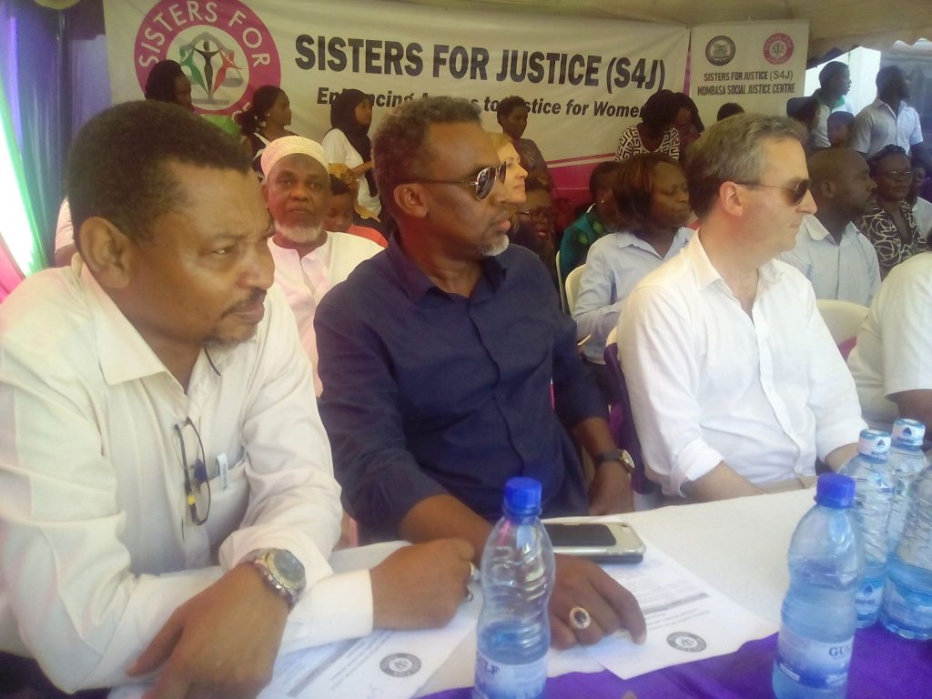 Lawyer Yusuf Abubakar, DPP Noordin Hajj and British High Commissioner Nick Hailey attending the launch of Sisters for Social Justice Centre at Mwandoni of Kisauni Subcounty in Mombasa County on April 25, 2019