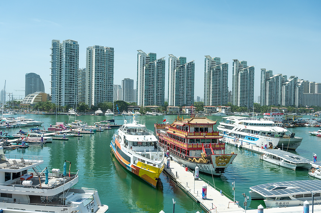 Yachts on display at sea during the China International Consumer Products Expo in Hainan, April 16, 2025.